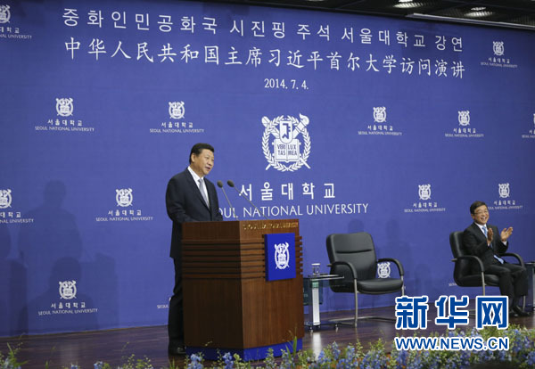????7月4日,國(guó)家主席習(xí)近平在韓國(guó)國(guó)立首爾大學(xué)發(fā)表題為《共創(chuàng)中韓合作未來(lái) 同襄亞洲振興繁榮》的重要演講。 新華社記者 蘭紅光 攝