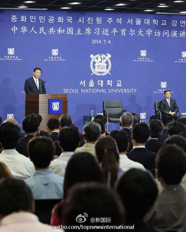 ??? 新華網(wǎng)北京7月4日電 據(jù)新華社“新國(guó)際”微博報(bào)道,首爾大學(xué)的大講堂座無(wú)虛席,傾聽(tīng)中國(guó),感受中韓夢(mèng)想的交匯。習(xí)主席說(shuō),要有海納百川的胸懷,以開(kāi)放包容心態(tài)虛心傾聽(tīng)世界的聲音。中國(guó)將繼續(xù)向世界學(xué)習(xí)、向各國(guó)人民學(xué)習(xí),學(xué)習(xí)人類(lèi)創(chuàng)造的一切文明成果,推動(dòng)中國(guó)和世界發(fā)展得更好。?