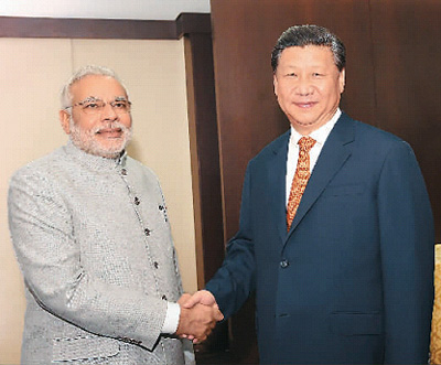 習近平強調,中印雙方要加強交往,我期待著在不久的將來訪問印度,歡迎莫迪總理早日訪華。雙方要對接各自發(fā)展戰(zhàn)略,建立更加緊密的發(fā)展伙伴關系,擴大文化、教育、宗教、青年等領域友好交流,在鐵路等基礎設施建設、產(chǎn)業(yè)投資等領域打造一批示范性項目,擴大服務貿(mào)易、投資、旅游等領域合作,逐步實現(xiàn)雙邊貿(mào)易總體平衡和可持續(xù)發(fā)展,推進孟中印緬經(jīng)濟走廊建設,引領區(qū)域經(jīng)濟一體化進程。中印要加強多邊領域合作,共同參與國際規(guī)則制定,增強發(fā)展中國家的話語權。中方歡迎印方作為創(chuàng)始成員加入亞洲基礎設施投資銀行。雙方要以積極和向前看的態(tài)度管控和處理分歧,通過友好協(xié)商,盡早找到公平合理、雙方都能接受的邊界問題解決辦法。在最終解決前,共同維護好邊境地區(qū)和平安寧。