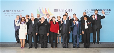 本報巴西利亞7月16日電?。ㄓ浾叨派袧?、丁剛)7月16日,金磚國家同南美國家領導人對話會在巴西利亞舉行。中國國家主席習近平、巴西總統(tǒng)羅塞夫、俄羅斯總統(tǒng)普京、印度總理莫迪、南非總統(tǒng)祖馬以及蘇里南總統(tǒng)鮑特塞、阿根廷總統(tǒng)克里斯蒂娜、玻利維亞總統(tǒng)莫拉萊斯、哥倫比亞總統(tǒng)桑托斯、智利總統(tǒng)巴切萊特、厄瓜多爾總統(tǒng)科雷亞、圭亞那總統(tǒng)拉莫塔爾、巴拉圭總統(tǒng)卡特斯、秘魯總統(tǒng)烏馬拉、烏拉圭總統(tǒng)穆???、委內瑞拉總統(tǒng)馬杜羅等南美國家領導人共同出席。