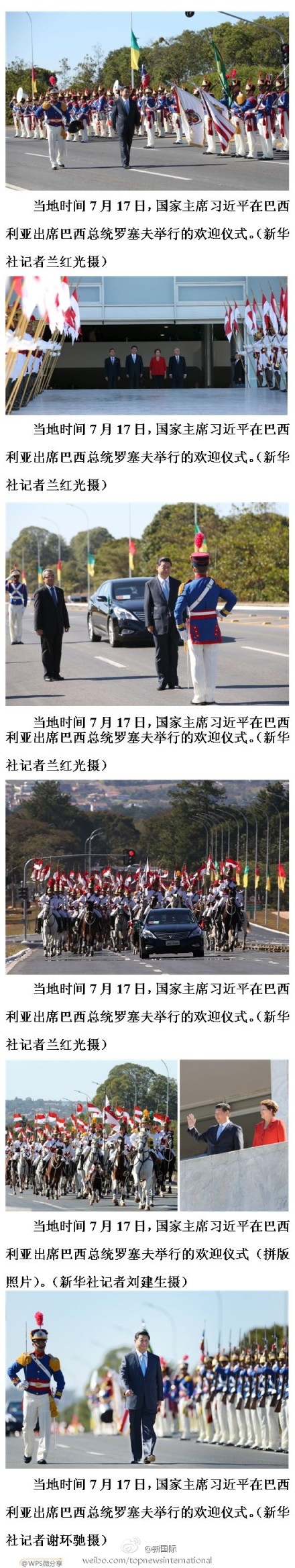 ????新華網(wǎng)北京7月18日電 據(jù)新華社“新國際”微博報道,17日,巴西總統(tǒng)羅塞夫為習(xí)近平舉行隆重歡迎儀式。在總統(tǒng)府入口處,習(xí)近平與羅塞夫親切握手、問候。軍樂團(tuán)奏中巴國歌,升中國國旗,鳴禮炮21響。隨后,兩位元首一同登上觀禮臺,觀看儀仗隊分列式。騎兵馬隊簇?fù)碇娖欤简v跳躍,奮蹄疾馳。?