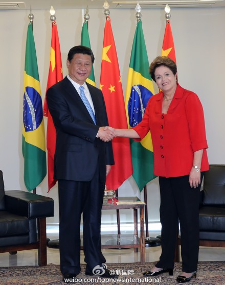 ??? 據(jù)新華社“新國(guó)際”微博報(bào)道,習(xí)近平17日與巴西總統(tǒng)羅塞夫會(huì)談時(shí)表示,中巴政治和戰(zhàn)略互信達(dá)到前所未有的高水平,利益聯(lián)系達(dá)到前所未有的緊密程度,兩國(guó)已經(jīng)成為命運(yùn)共同體。雙方應(yīng)該加強(qiáng)交流合作,共同維護(hù)發(fā)展中國(guó)家共同利益,推動(dòng)國(guó)際力量對(duì)比朝著更加均衡方向發(fā)展。(蘭紅光攝)