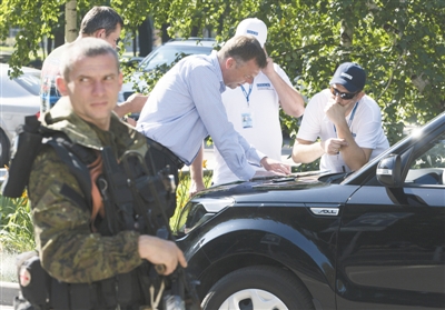 7月30日,烏克蘭頓涅茨克,歐安組織調(diào)查人員看地圖分析周圍安全形勢(shì)。由于烏內(nèi)戰(zhàn)仍在繼續(xù),調(diào)查人員已經(jīng)連續(xù)4天未能進(jìn)入MH17墜機(jī)現(xiàn)場(chǎng)。