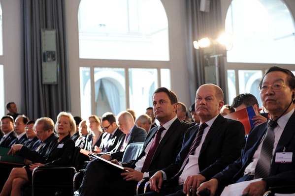 ????盧森堡首相貝特爾(右三)、漢堡市市長舍爾茨(右二)、中國工業(yè)經(jīng)濟(jì)聯(lián)合會(huì)會(huì)長李毅中(右一)出席第六屆漢堡峰會(huì)開幕式。新華社記者商婧攝