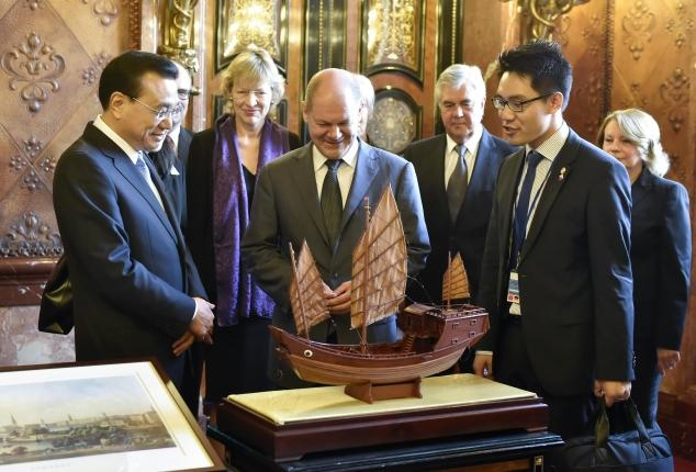 漢堡市政廳里,克強(qiáng)總理將一艘明代商船的復(fù)制模型,贈(zèng)給漢堡市市長(zhǎng)肖爾茨。