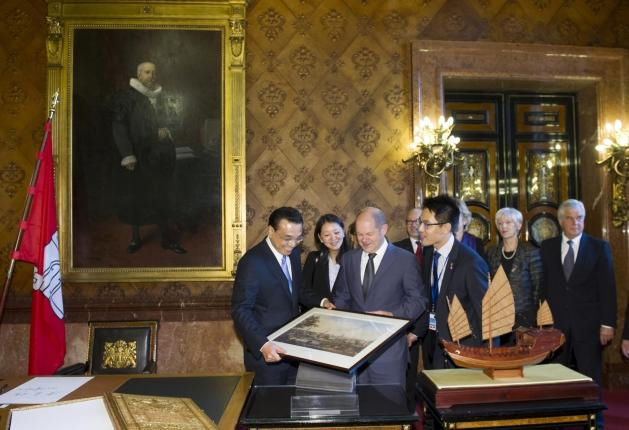 “這是一艘明代的商船,它曾到過非洲的東海岸,可惜沒能來(lái)到漢堡,不過它眺望過漢堡,現(xiàn)在終于來(lái)到漢堡了,”克強(qiáng)總理說(shuō)。肖爾茨贈(zèng)給克強(qiáng)總理的是一幅描繪漢堡市中心風(fēng)景的圖畫。