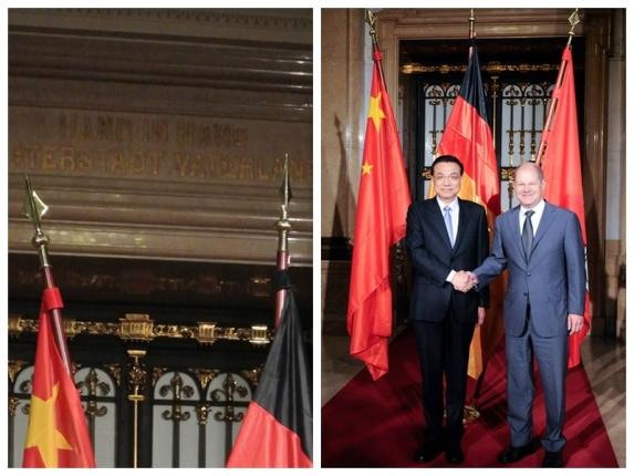市政廳里,站在代表中國(guó)、德國(guó)和漢堡的三面旗幟前,克強(qiáng)總理與肖爾茨市長(zhǎng)的手緊緊相握。在他們的身后,大門門楣上鐫刻著這樣一句話“hand in hand”。