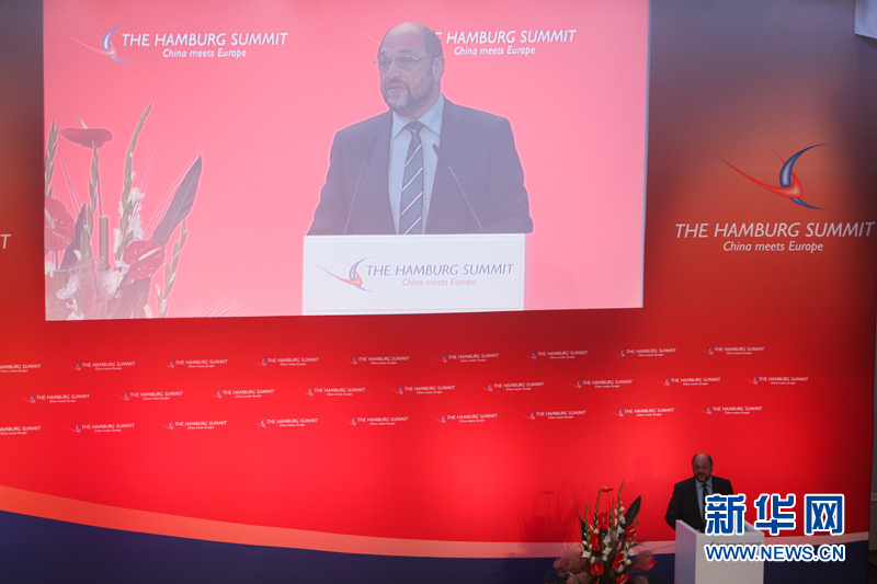 ??? 10月11日,在德國漢堡舉行的中歐論壇漢堡峰會上,歐洲議會主席馬丁?舒爾茨發(fā)言。中歐論壇漢堡峰會第六屆會議11日在德國漢堡閉幕。本屆峰會以“中國與歐洲相遇”為主題。來自中歐政治、經濟和學術界的500多位代表聚集在一起,探討中歐經貿合作未來趨勢、中國經濟的綠色發(fā)展等重要議題。新華社記者張帆攝