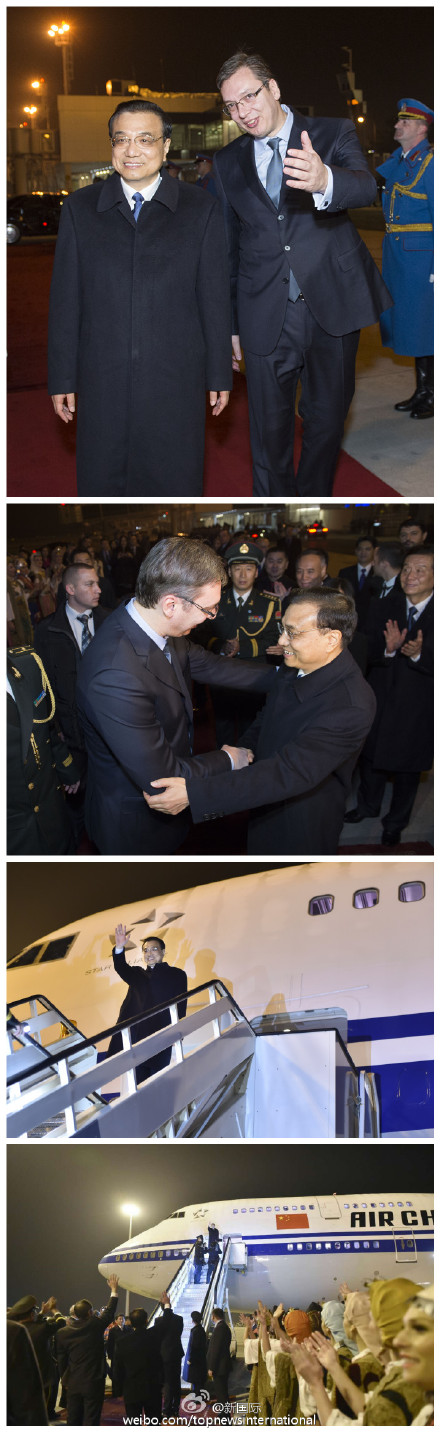 ??? 李克強總理當(dāng)?shù)貢r間18日傍晚乘專機離開塞爾維亞首都貝爾格萊德。在塞期間,李克強出席了中國—中東歐國家領(lǐng)導(dǎo)人第三次會議并成功對塞爾維亞進(jìn)行了首訪。塞爾維亞總理武契奇率兩位副總理和多位部長到機場送行。