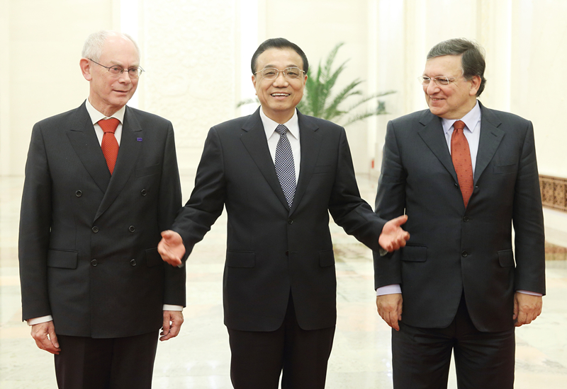 2013年11月21日,國務(wù)院總理李克強(qiáng)在北京人民大會(huì)堂同歐洲理事會(huì)主席范龍佩、歐盟委員會(huì)主席巴羅佐共同主持第十六次中國歐盟領(lǐng)導(dǎo)人會(huì)晤。(新華社記者姚大偉攝)