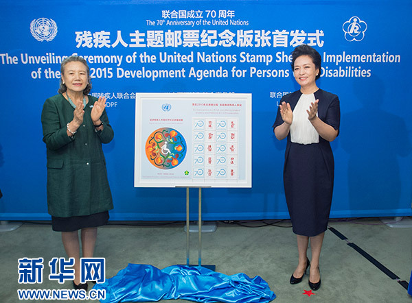 新華網(wǎng)聯(lián)合國(guó)9月27日電(記者霍小光)當(dāng)?shù)貢r(shí)間27日上午,國(guó)家主席習(xí)近平夫人彭麗媛在紐約出席殘疾人主題郵票紀(jì)念版張首發(fā)式。彭麗媛同聯(lián)合國(guó)秘書長(zhǎng)潘基文夫人柳淳澤一道為紀(jì)念版張揭幕。