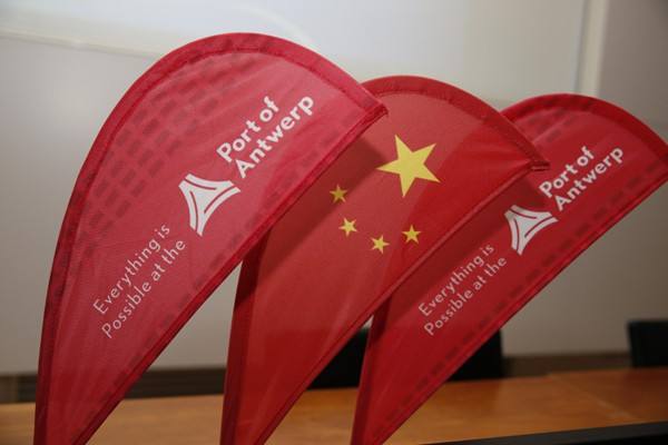 ↑會場的中國國旗與安特衛(wèi)普港標識。