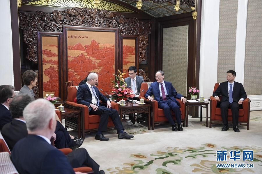 4月11日,國(guó)家副主席王岐山在北京中南海會(huì)見(jiàn)英國(guó)內(nèi)閣辦公廳大臣利丁頓率領(lǐng)的第十屆中英政黨對(duì)話英方代表團(tuán)。 新華社記者 張領(lǐng) 攝