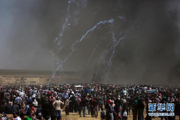 5月14日,在加沙城以東的加沙地帶與以色列交界地區(qū),巴勒斯坦示威者與以色列軍隊(duì)發(fā)生沖突。巴勒斯坦民眾14日在巴各地舉行大規(guī)模游行示威,抗議美國駐以色列使館在耶路撒冷開館。新華社發(fā)