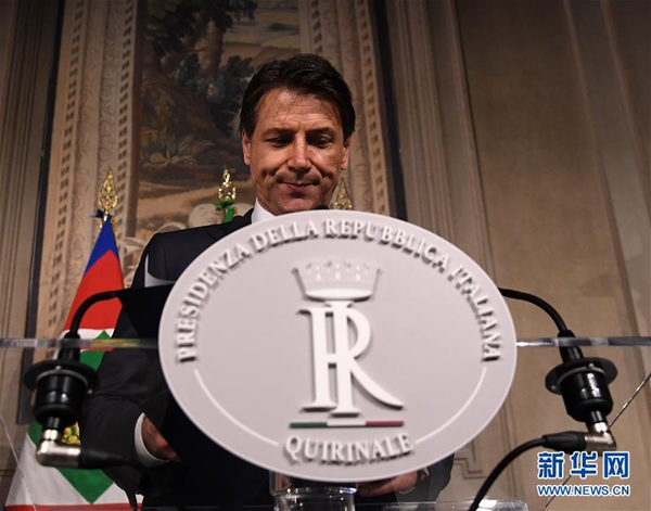 5月27日,在意大利首都羅馬,意新任總理孔特發(fā)表講話。據當地媒體報道,孔特27日晚間與總統馬塔雷拉會面并提交擬定的內閣成員名單時,馬塔雷拉否決了由意大利聯盟黨和五星運動力推的持疑歐立場的經濟學家保羅·薩沃納出任財政部長??滋叵蚩偨y提出放棄組閣任務請求,請求得到總統確認。新華社發(fā)(阿爾貝托·林格里亞攝)
