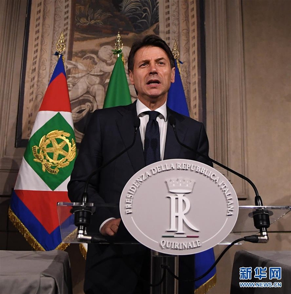 5月27日,在意大利首都羅馬,意新任總理孔特發(fā)表講話。據(jù)當(dāng)?shù)孛襟w報(bào)道,孔特27日晚間與總統(tǒng)馬塔雷拉會(huì)面并提交擬定的內(nèi)閣成員名單時(shí),馬塔雷拉否決了由意大利聯(lián)盟黨和五星運(yùn)動(dòng)力推的持疑歐立場(chǎng)的經(jīng)濟(jì)學(xué)家保羅·薩沃納出任財(cái)政部長(zhǎng)??滋叵蚩偨y(tǒng)提出放棄組閣任務(wù)請(qǐng)求,請(qǐng)求得到總統(tǒng)確認(rèn)。新華社發(fā)(阿爾貝托·林格里亞攝)