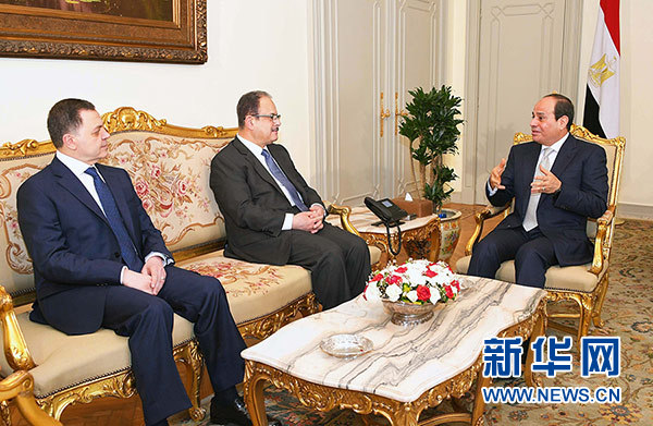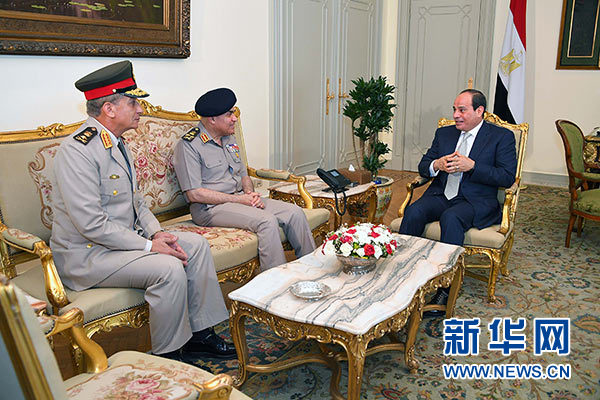 6月14日,在埃及首都開羅,埃及總統(tǒng)塞西(右一)和本屆內(nèi)閣新當選成員國防部長穆罕默德·扎基(左一)和前任國防部長西德基·蘇卜希(左二)交談。新華社/中東社