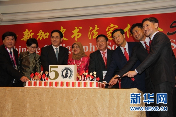 中國駐新加坡大使洪小勇(左三)、新加坡總統(tǒng)哈莉瑪·雅各布(左四)和新加坡書法家協(xié)會(huì)會(huì)長陳聲桂,在新加坡書法家協(xié)會(huì)成立50周年慶午宴上切蛋糕。記者王麗麗 攝