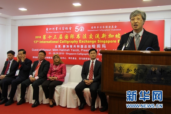 國際書法家聯(lián)合總會(huì)秘書長陳洪武在致辭時(shí)說,新加坡書法家協(xié)會(huì)是新加坡最早的全國性書法組織,也是國際書法家聯(lián)合總會(huì)的發(fā)起者和首創(chuàng)者之一。