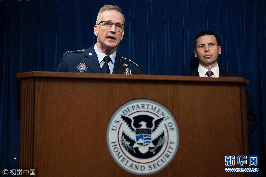 當(dāng)?shù)貢r間2018年10月29日,美國華盛頓,美軍北方司令部司令奧肖內(nèi)西、美國海關(guān)和邊境保護局長凱文·麥卡利南舉行記者會。奧肖內(nèi)西29日宣布,美軍將派遣5200名現(xiàn)役士兵前往南部邊境,應(yīng)對中美洲移民潮。近日,數(shù)千名來自洪都拉斯、危地馬拉和薩爾瓦多等中美洲國家的民眾穿越邊界進入墨西哥。他們或步行、或乘坐大篷車北上,有意穿越墨西哥前往美國。(圖片來源:視覺中國)