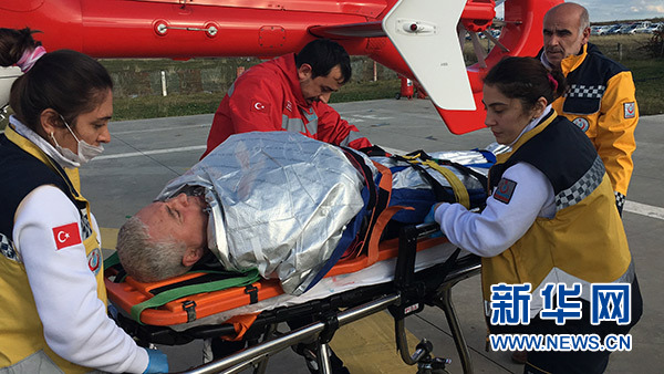 1月7日,在土耳其薩姆松,救援人員準(zhǔn)備用直升機運送受傷船員。 新華社發(fā)