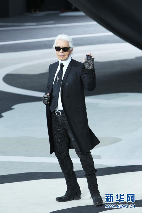 這是2013年3月5日在法國(guó)巴黎拍攝的卡爾·拉格菲爾德參加巴黎高級(jí)定制周香奈兒品牌時(shí)裝秀的資料照片。 新華社記者 高靜 攝
