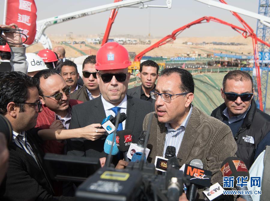 2月25日,在埃及開羅以東約50公里處的新首都中央商務(wù)區(qū),埃及總理穆斯塔法·馬德布利(右二)接受媒體采訪。 埃及總理穆斯塔法·馬德布利25日上午視察了由中國建筑股份有限公司承建的埃及新首都中央商務(wù)區(qū),并見證了標(biāo)志塔主樓1.85萬立方米超大型混凝土基礎(chǔ)底板開盤澆筑。埃及新行政首都中央商務(wù)區(qū)位于首都開羅以東約50公里處,總占地面積約50.5萬平方米,包含20個高層建筑單體及配套市政工程。 新華社記者鄔惠我攝