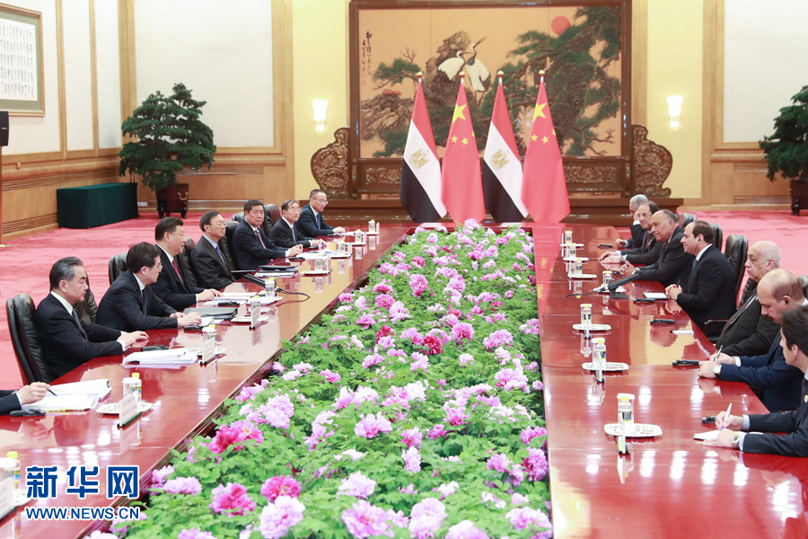 習(xí)近平強(qiáng)調(diào),埃及是非洲聯(lián)盟輪值主席國(guó),總統(tǒng)先生來(lái)華出席第二屆“一帶一路”國(guó)際合作高峰論壇,不僅體現(xiàn)了埃及積極參與共建“一帶一路”的真誠(chéng)意愿,也代表著非洲國(guó)家尋求互利共贏、實(shí)現(xiàn)共同發(fā)展的普遍呼聲。中方高度重視發(fā)展同埃及關(guān)系。雙方要深化政治互信,繼續(xù)在涉及彼此核心利益和重大關(guān)切問(wèn)題上相互支持和配合。中方始終支持埃及探索符合本國(guó)國(guó)情的發(fā)展道路,愿積極參與蘇伊士運(yùn)河走廊開(kāi)發(fā)計(jì)劃,持續(xù)推進(jìn)蘇伊士經(jīng)貿(mào)合作區(qū)建設(shè)及產(chǎn)能、基礎(chǔ)設(shè)施建設(shè)等領(lǐng)域合作。中方還將在埃及設(shè)立“魯班工坊”,向埃及青年提供職業(yè)技能培訓(xùn)。雙方要深化反恐和安全合作,持續(xù)密切人文交流。中國(guó)感謝非洲人民對(duì)中國(guó)的信任,我們支持非洲和平安全與可持續(xù)發(fā)展倡議和非洲一體化進(jìn)程,愿同埃方加強(qiáng)對(duì)非三方合作,共同促進(jìn)非洲基礎(chǔ)設(shè)施建設(shè)。