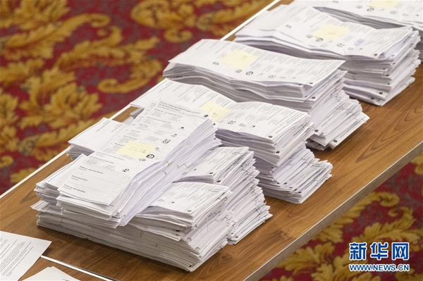 這是5月26日在英國(guó)南安普敦的一個(gè)計(jì)票站拍攝的選票。五年一次的歐洲議會(huì)選舉23日至26日在歐盟28個(gè)成員國(guó)間舉行。選民將選舉出751名議員,組成第九屆歐洲議會(huì),任期5年。新華社發(fā)(雷伊·唐 攝)