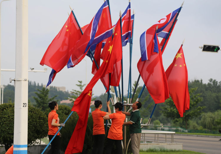 6月19日,當(dāng)?shù)毓ぷ魅藛T在平壤市區(qū)街邊安裝朝中兩國國旗。新華社記者江亞平攝