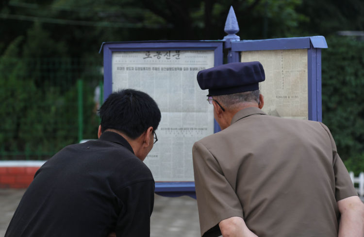 6月19日,在平壤凱旋門附近的一處報紙櫥窗前,市民閱讀習(xí)近平總書記在朝鮮主流媒體《勞動新聞》發(fā)表的署名文章。新華社記者江亞平攝