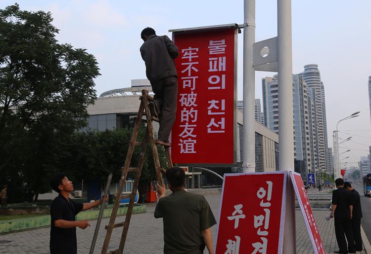 6月19日,工作人員在平壤街頭懸掛使用中朝雙語書寫的“牢不可破的友誼”標(biāo)語牌。新華社記者江亞平攝