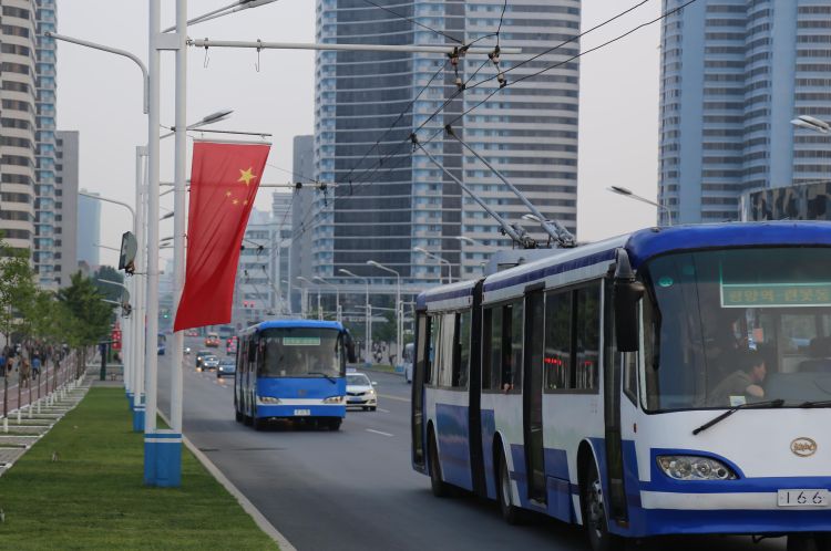 6月19日,平壤市區(qū)主要大街倉田大街兩旁已經(jīng)懸掛著朝中兩國國旗。新華社記者江亞平攝