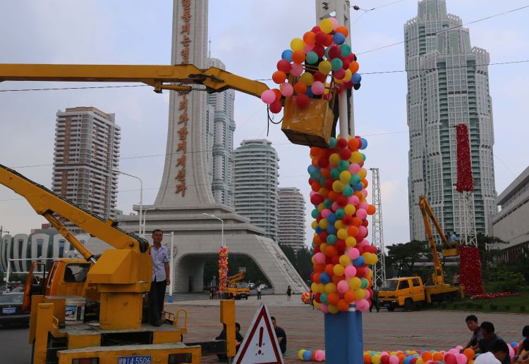 6月19日,當(dāng)?shù)毓ぷ魅藛T在平壤黎明大街街邊懸掛彩球。新華社記者江亞平攝