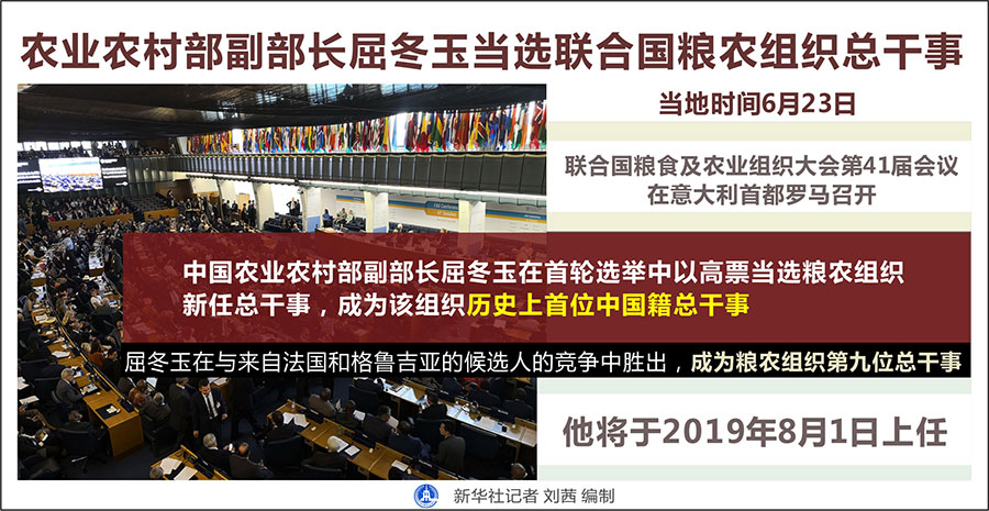 新華社羅馬6月23日電(記者陳占杰)聯(lián)合國(guó)糧食及農(nóng)業(yè)組織大會(huì)第41屆會(huì)議23日在意大利首都羅馬召開,中國(guó)農(nóng)業(yè)農(nóng)村部副部長(zhǎng)屈冬玉在首輪選舉中以高票當(dāng)選糧農(nóng)組織新任總干事,成為該組織歷史上首位中國(guó)籍總干事。