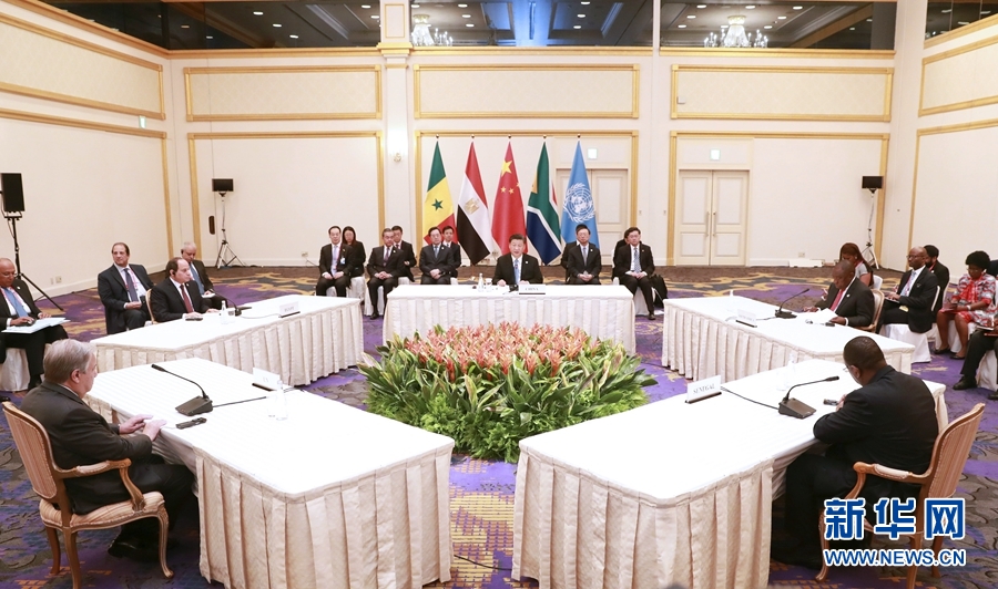 6月28日,國家主席習近平在大阪主持中非領導人會晤。中非合作論壇前任非方共同主席國南非總統(tǒng)拉馬福薩、非洲聯(lián)盟輪值主席國埃及總統(tǒng)塞西、中非合作論壇現(xiàn)任非方共同主席國塞內(nèi)加爾總統(tǒng)薩勒和聯(lián)合國秘書長古特雷斯出席。 新華社記者 龐興雷 攝