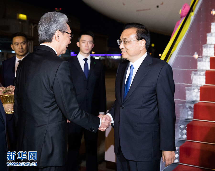 當(dāng)?shù)貢r(shí)間11月2日晚,應(yīng)泰王國(guó)總理巴育邀請(qǐng),國(guó)務(wù)院總理李克強(qiáng)乘專機(jī)抵達(dá)曼谷素萬(wàn)那普機(jī)場(chǎng),將出席第22次中國(guó)-東盟(10+1)領(lǐng)導(dǎo)人會(huì)議、第22次東盟與中日韓(10+3)領(lǐng)導(dǎo)人會(huì)議和第14屆東亞峰會(huì)(EAS),并對(duì)泰國(guó)進(jìn)行正式訪問(wèn)。泰國(guó)副總理頌奇率政府高級(jí)官員到機(jī)場(chǎng)迎接。 新華社記者 黃敬文 攝
