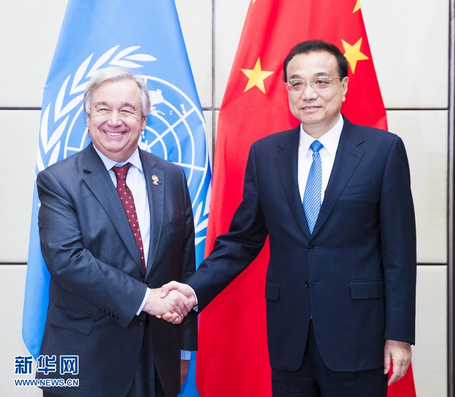 11月3日,國(guó)務(wù)院總理李克強(qiáng)在曼谷會(huì)見(jiàn)聯(lián)合國(guó)秘書長(zhǎng)古特雷斯。 新華社記者 黃敬文 攝