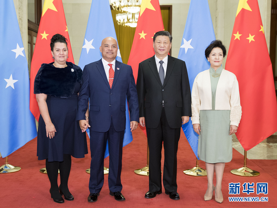 12月13日,國家主席習近平在北京人民大會堂同密克羅尼西亞聯(lián)邦總統(tǒng)帕努埃洛會談。這是會談前,習近平和夫人彭麗媛同帕努埃洛總統(tǒng)和埃德溫女士合影。 新華社記者 黃敬文 攝