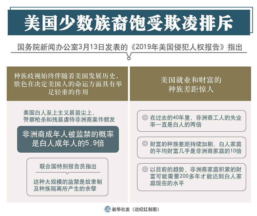 新華社北京3月13日電(記者王子銘、申安妮)國務(wù)院新聞辦13日發(fā)表的《2019年美國侵犯人權(quán)報告》指出,美國少數(shù)族裔飽受欺凌排斥。