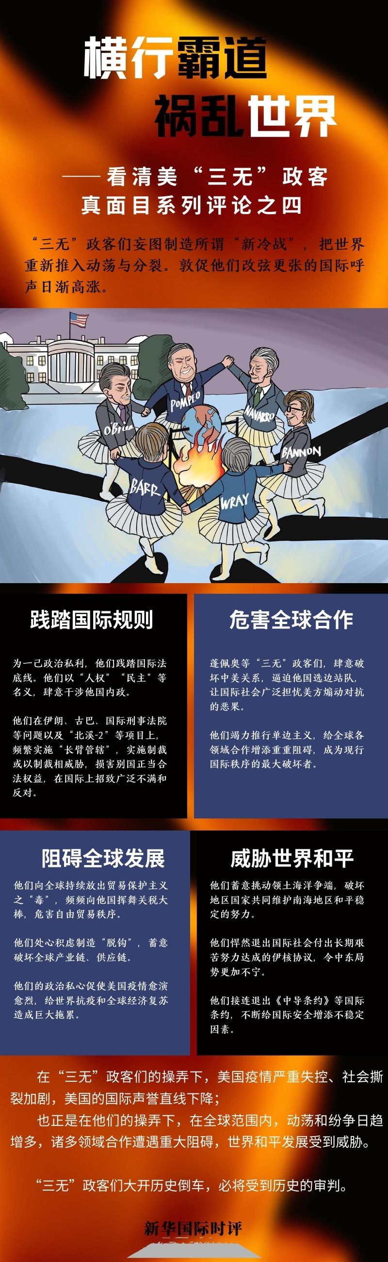 “三無”政客們的亂言與惡行,正在美國和國際上造成種種惡果。正是在他們的操弄下,美國疫情嚴(yán)重失控、社會(huì)撕裂加劇,美國的國際聲譽(yù)直線下降;也正是在他們的操弄下,在全球范圍內(nèi),動(dòng)蕩和紛爭(zhēng)日趨增多,諸多領(lǐng)域合作遭遇重大阻礙,世界和平發(fā)展受到威脅?!叭裏o”政客們大開歷史倒車,必將受到歷史的審判。