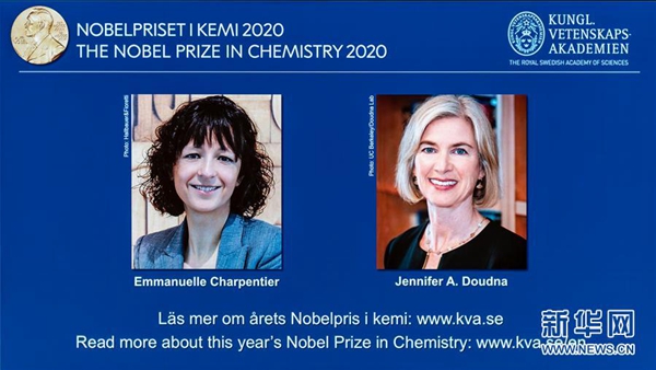 10月7日,在瑞典斯德哥爾摩,瑞典皇家科學(xué)院諾獎(jiǎng)宣布現(xiàn)場(chǎng)電子屏幕上顯示兩位獲獎(jiǎng)的女科學(xué)家。新華社發(fā)(魏學(xué)超 攝)