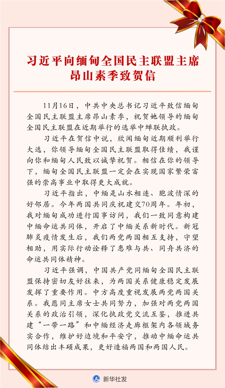 新華社北京11月17日電 11月16日,中共中央總書(shū)記習(xí)近平致信緬甸全國(guó)民主聯(lián)盟主席昂山素季,祝賀她領(lǐng)導(dǎo)的緬甸全國(guó)民主聯(lián)盟在近期舉行的選舉中蟬聯(lián)執(zhí)政。