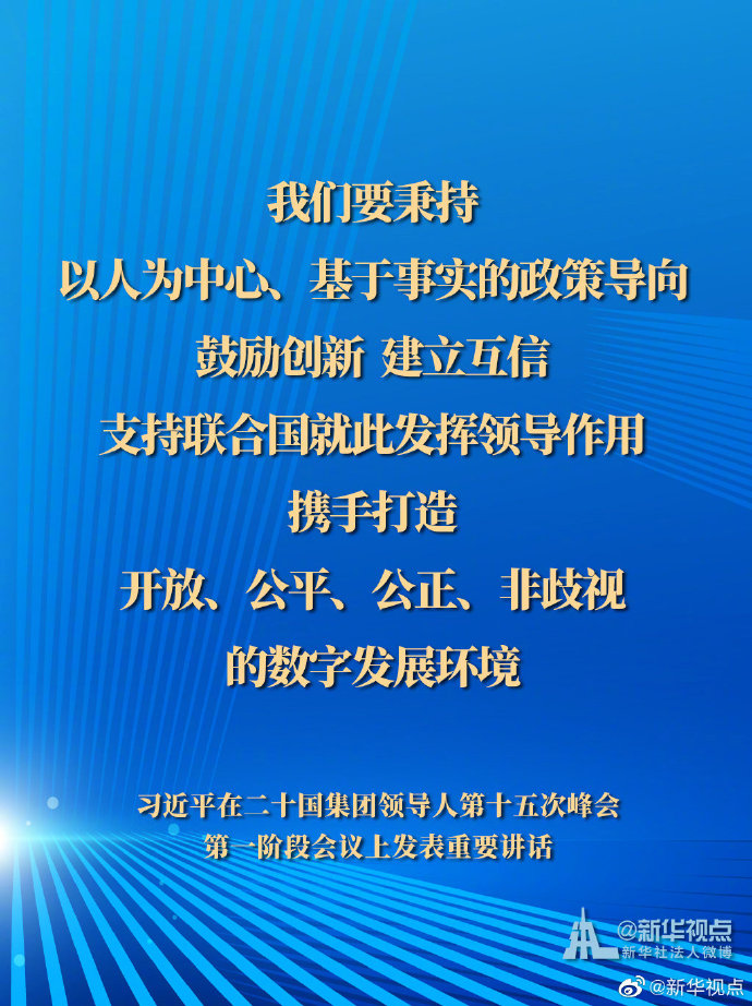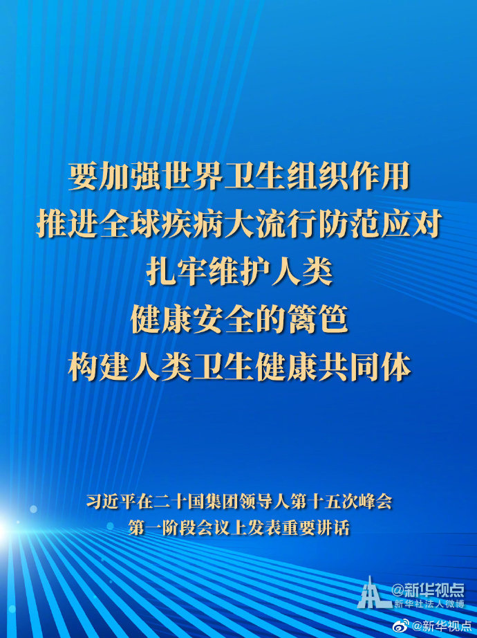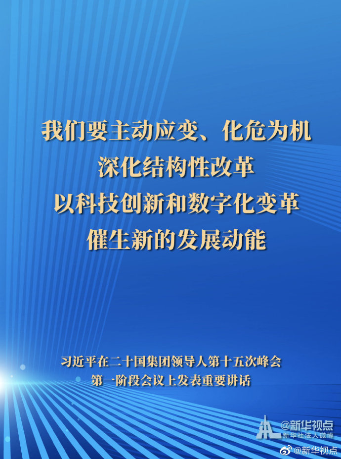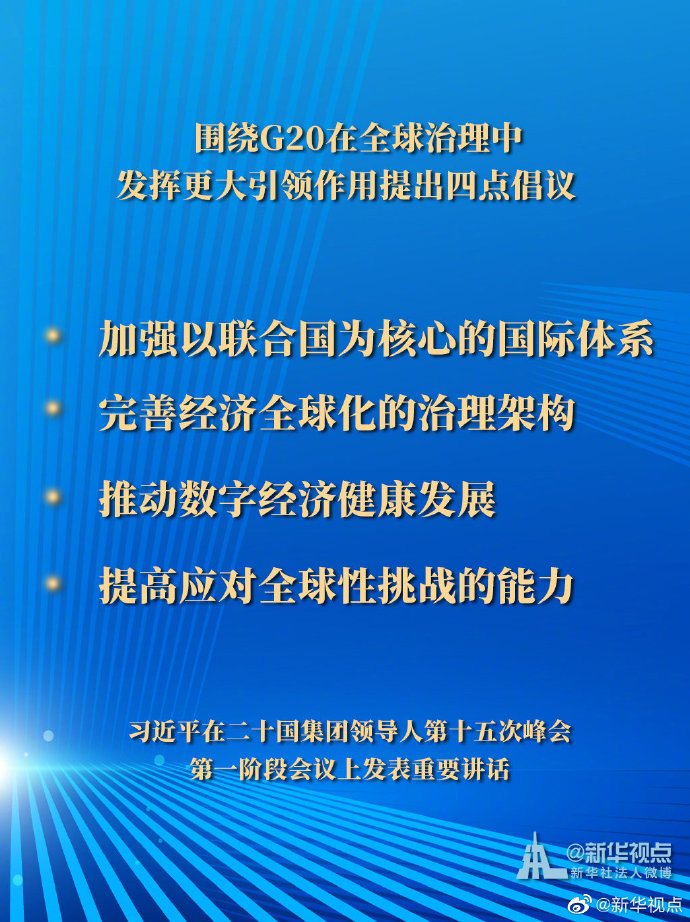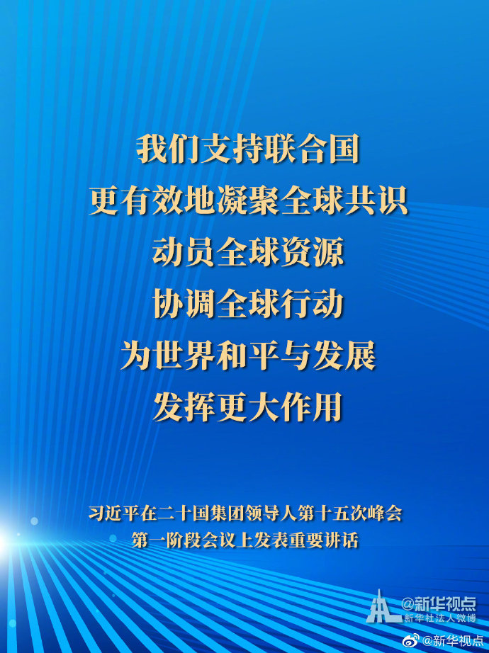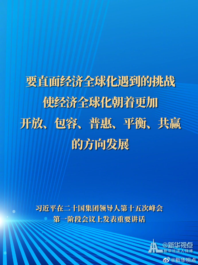 11月21日,國家主席習(xí)近平在二十國集團(tuán)領(lǐng)導(dǎo)人第十五次峰會第一階段會議上發(fā)表重要講話。一起來看習(xí)主席的G20金句。
