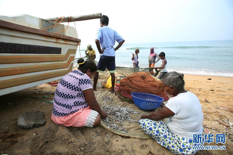 12月12日,在斯里蘭卡首都科倫坡附近的莫勒?qǐng)D沃,漁民在海邊分揀捕獲的魚。