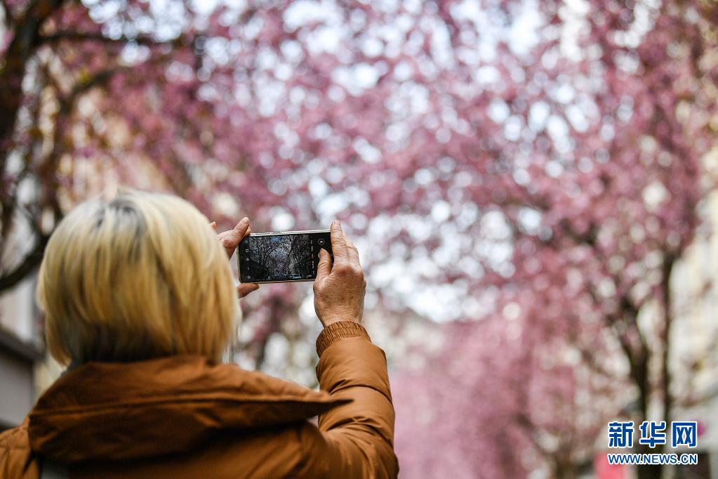 近日,德國西部城市波恩老城區(qū)的櫻花盛開,吸引了許多游人前來觀賞。